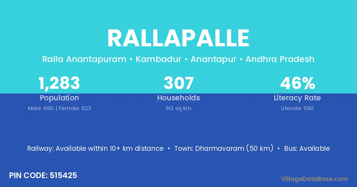 Dharmavaram (50 km) is the nearest town to Rallapalle village for major economic activities and is located approximately 50 km away.