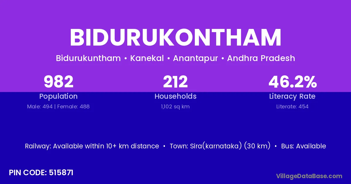 Sira(karnataka) (30 km) is the nearest town to Bidurukontham village for major economic activities and is located approximately 30 km away.