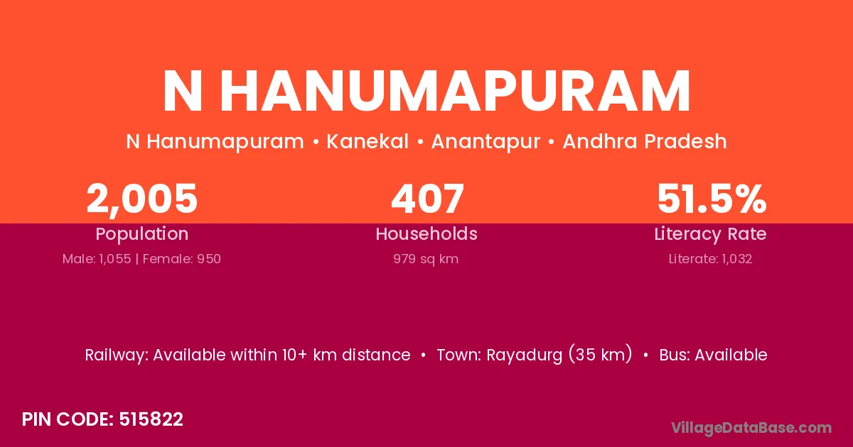 Rayadurg (35 km) is the nearest town to N Hanumapuram village for major economic activities and is located approximately 35 km away.