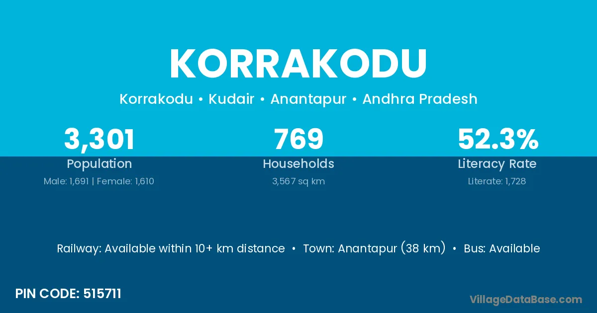 Anantapur (38 km) is the nearest town to Korrakodu village for major economic activities and is located approximately 38 km away.