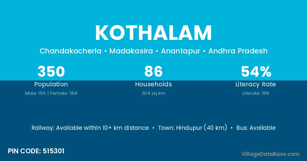 Hindupur (40 km) is the nearest town to Kothalam village for major economic activities and is located approximately 40 km away.