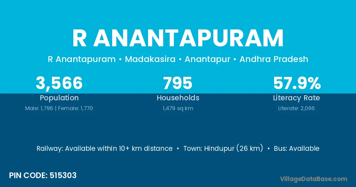 Hindupur (26 km) is the nearest town to R Anantapuram village for major economic activities and is located approximately 26 km away.