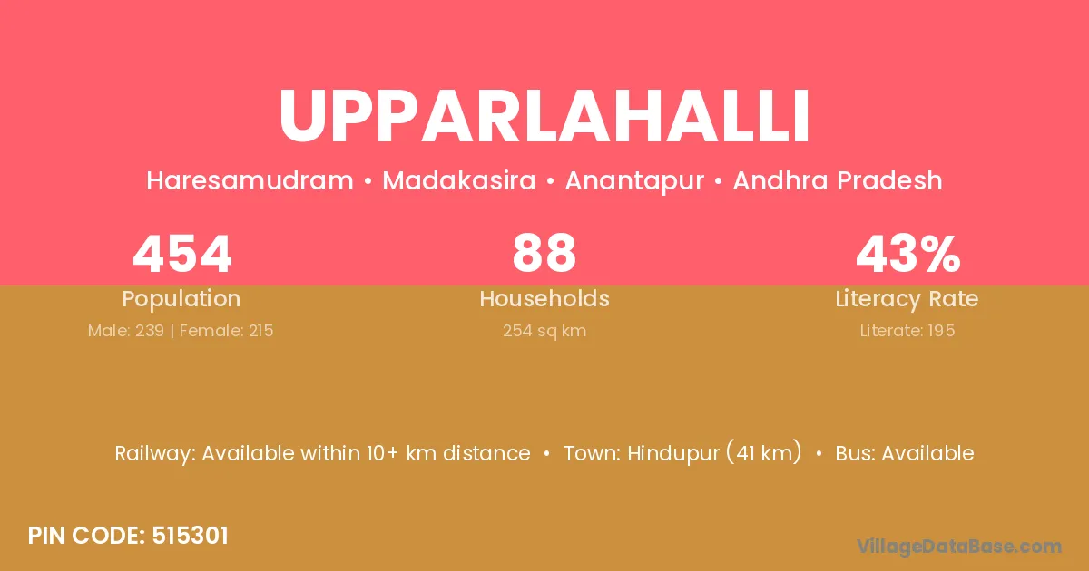 Hindupur (41 km) is the nearest town to Upparlahalli village for major economic activities and is located approximately 41 km away.