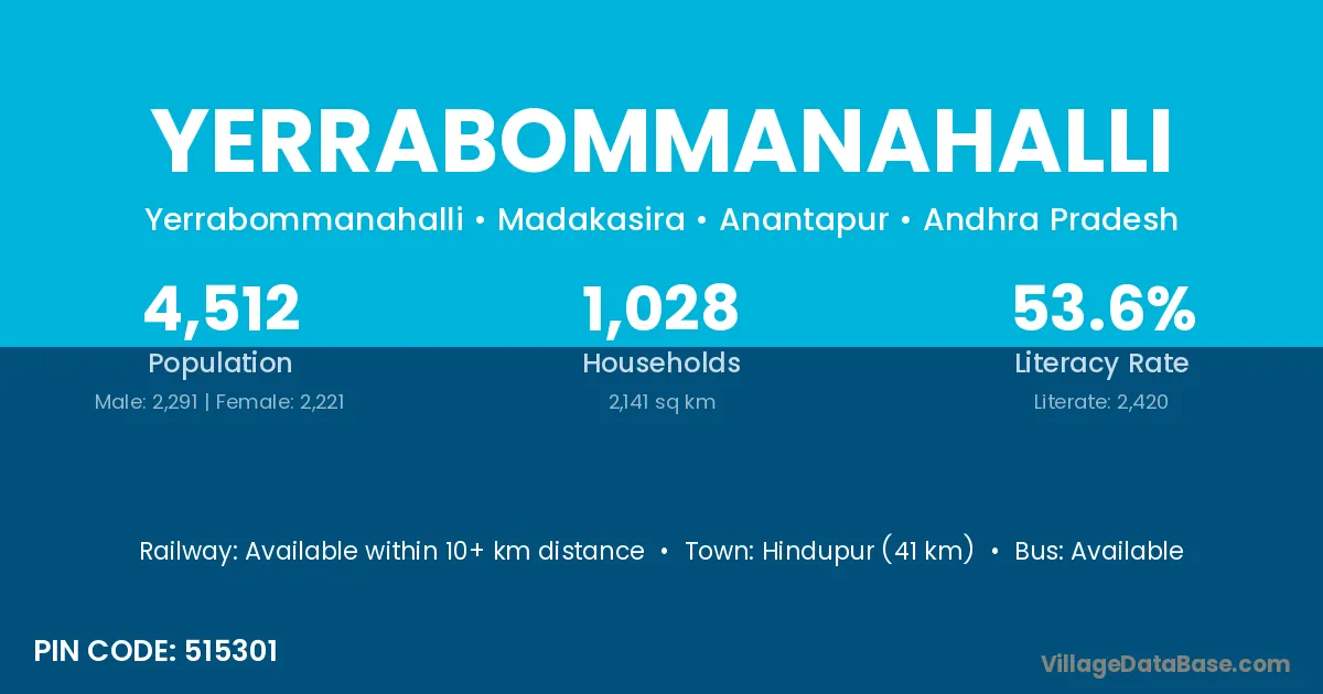 Hindupur (41 km) is the nearest town to Yerrabommanahalli village for major economic activities and is located approximately 41 km away.