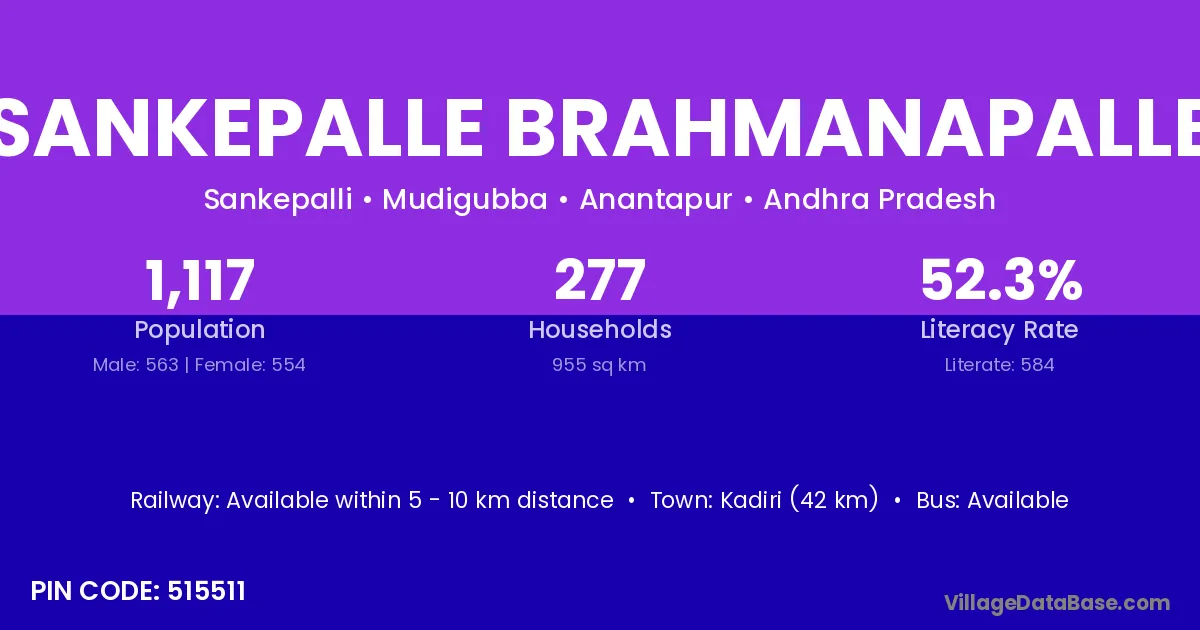 Sankepalle Brahmanapalle village has a total population of 1,117 people, of which 563 are males and 554 are females.