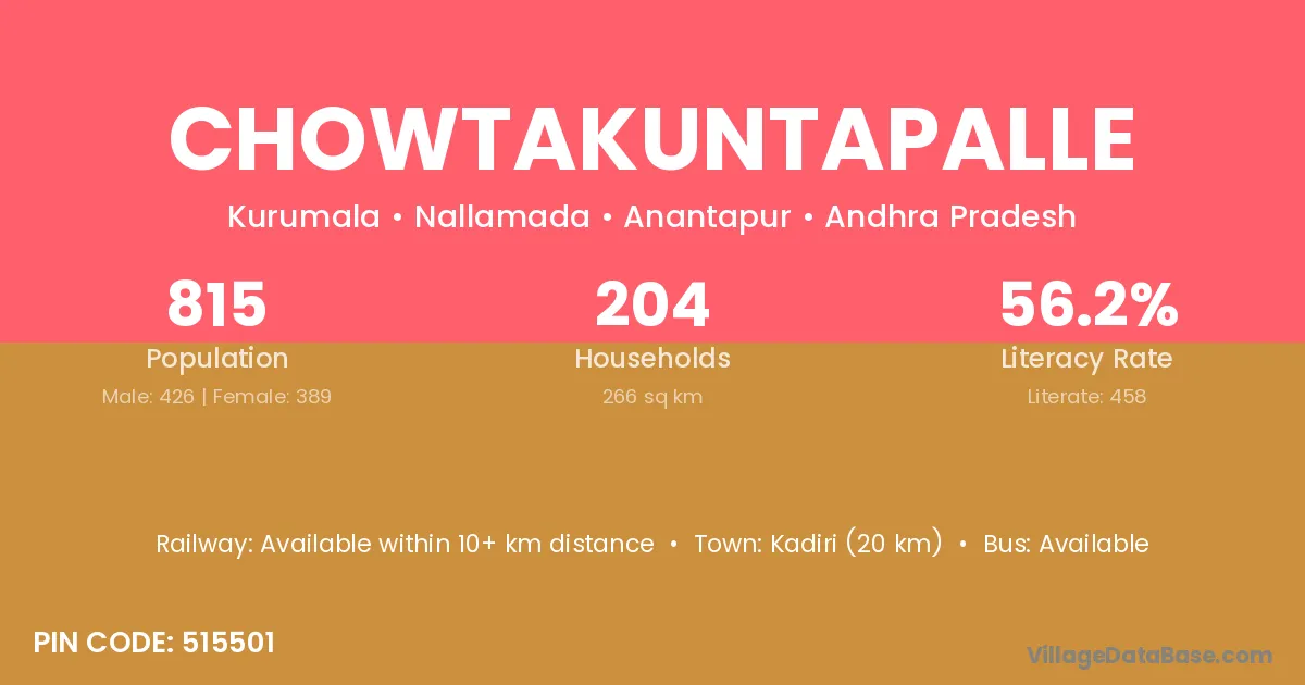 Kadiri (20 km) is the nearest town to Chowtakuntapalle village for major economic activities and is located approximately 20 km away.