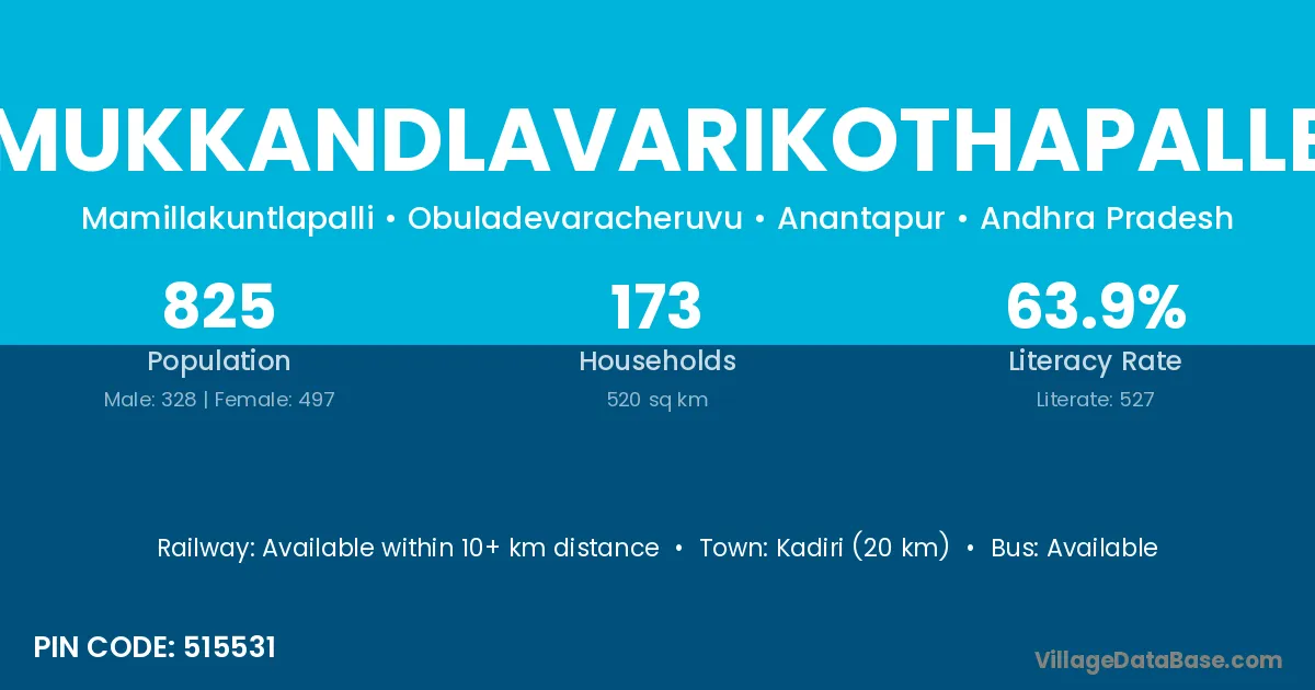 Kadiri (20 km) is the nearest town to Mukkandlavarikothapalle village for major economic activities and is located approximately 20 km away.
