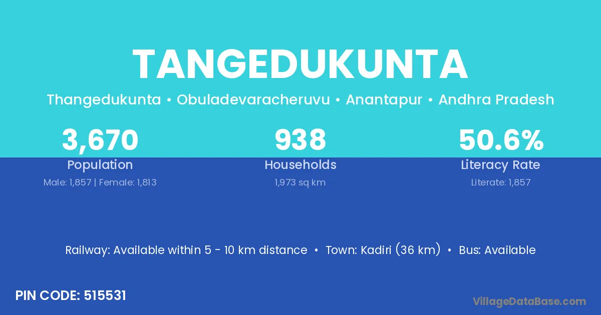 Tangedukunta village has a total population of 3,670 people, of which 1,857 are males and 1,813 are females.