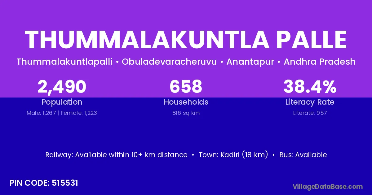 Kadiri (18 km) is the nearest town to Thummalakuntla Palle village for major economic activities and is located approximately 18 km away.