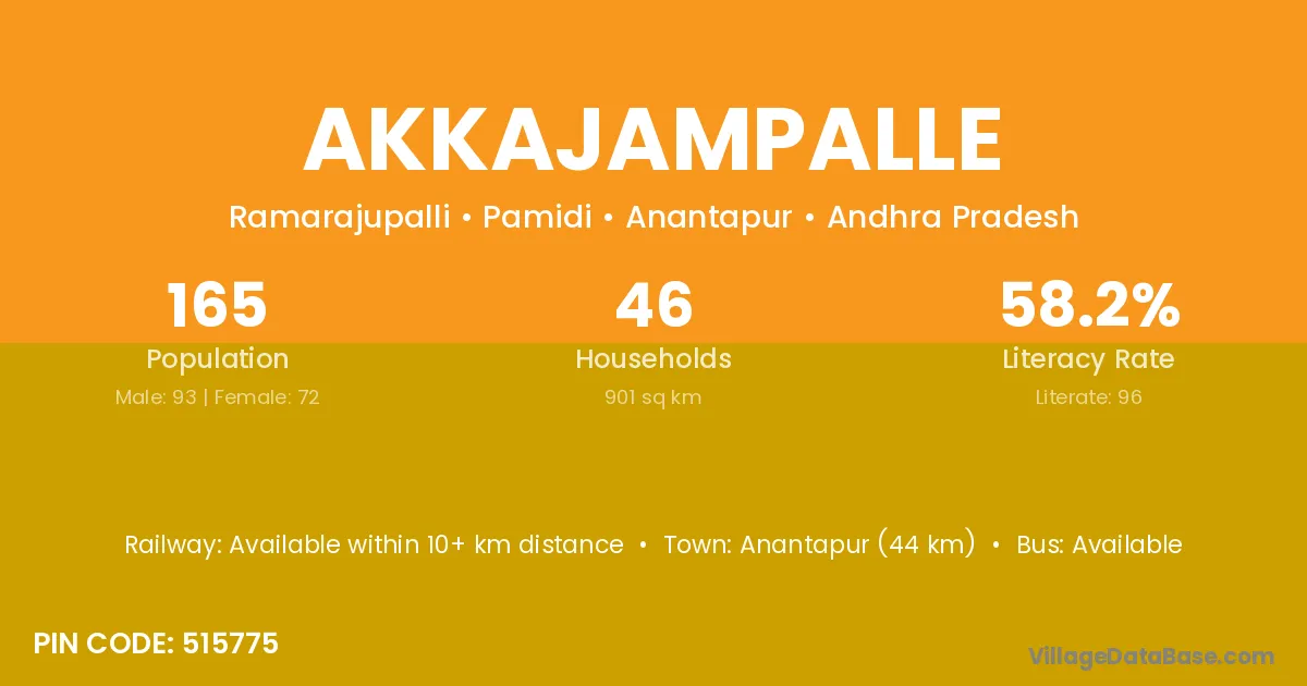 Anantapur (44 km) is the nearest town to Akkajampalle village for major economic activities and is located approximately 44 km away.