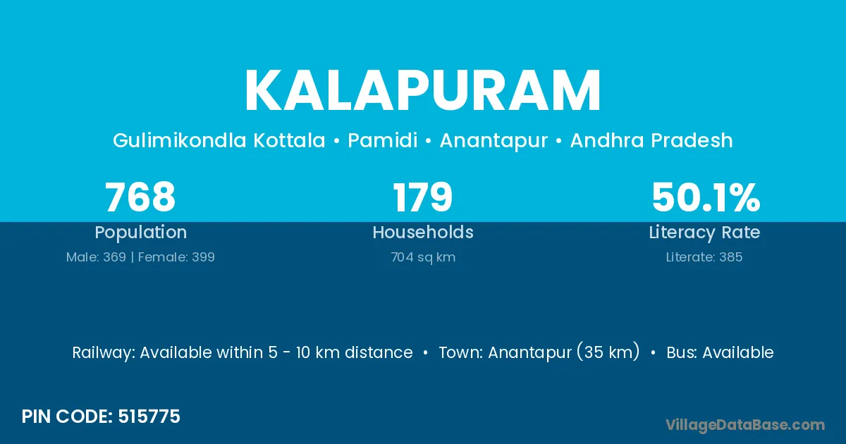 Anantapur (35 km) is the nearest town to Kalapuram village for major economic activities and is located approximately 35 km away.