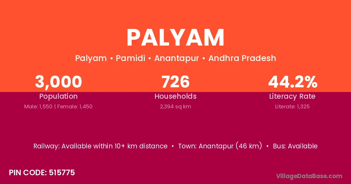Palyam village has a total population of 3,000 people, of which 1,550 are males and 1,450 are females.