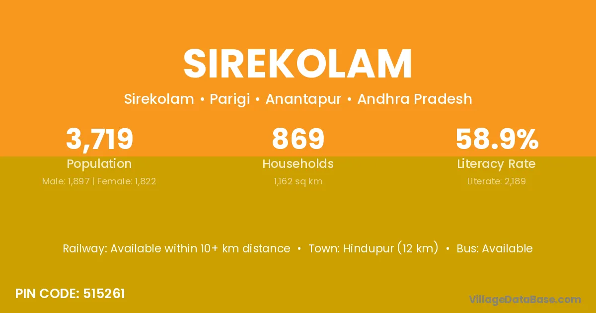 Hindupur (12 km) is the nearest town to Sirekolam village for major economic activities and is located approximately 12 km away.