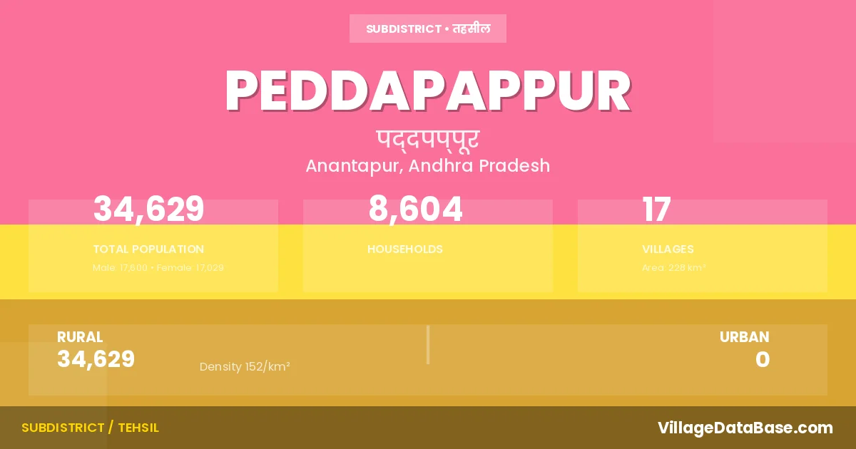 According to the 2011 census The total area of Peddapappur Mandal is 228 km², with a population of 34629 people. The population density is 152 inhabitants per square kilometre, and there are approximately 8604 houses in the sub district.