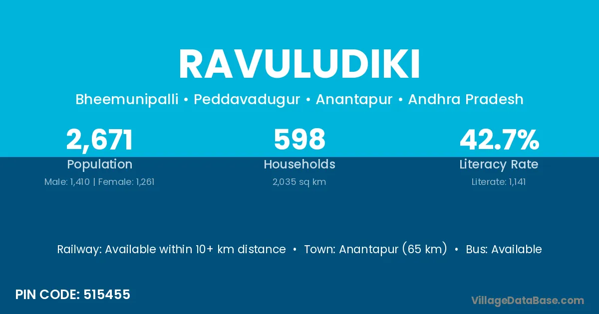 Anantapur (65 km) is the nearest town to Ravuludiki village for major economic activities and is located approximately 65 km away.