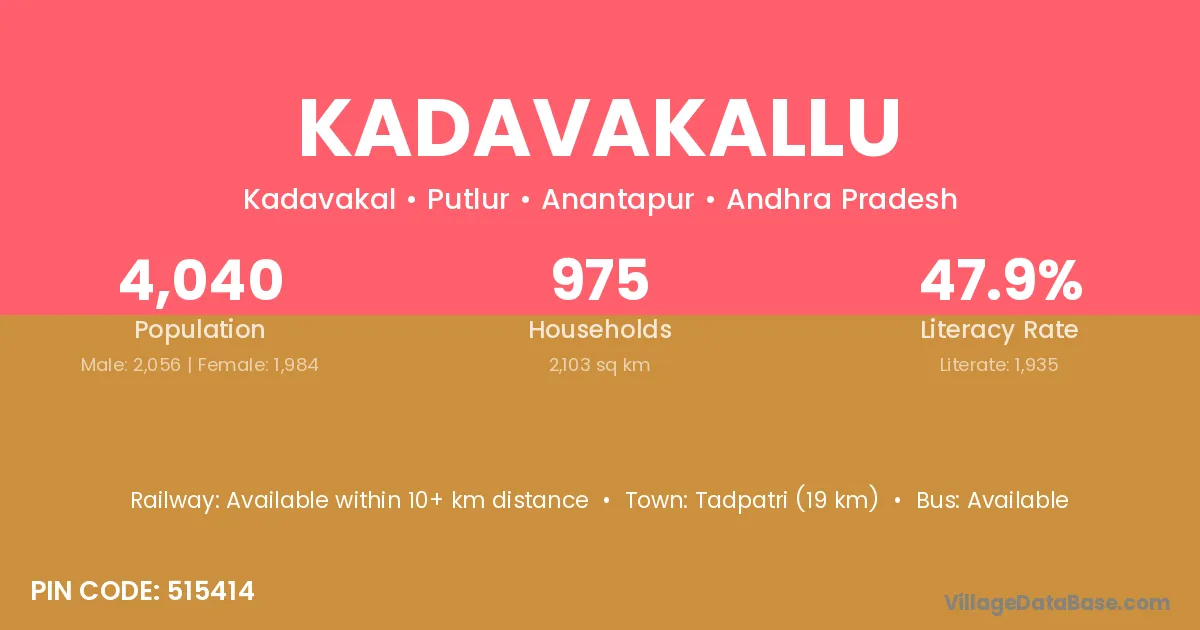 Kadavakallu village has a total population of 4,040 people, of which 2,056 are males and 1,984 are females.