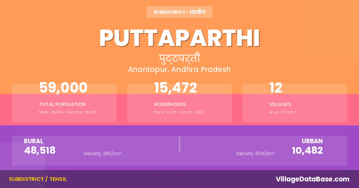 According to the 2011 census The total area of Puttaparthi Mandal is 237 km², with a population of 59000 people. The population density is 249 inhabitants per square kilometre, and there are approximately 15472 houses in the sub district.