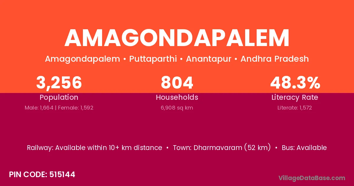 Amagondapalem village has a total population of 3,256 people, of which 1,664 are males and 1,592 are females.