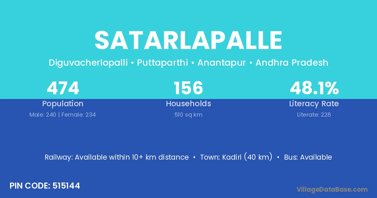 Kadiri (40 km) is the nearest town to Satarlapalle village for major economic activities and is located approximately 40 km away.