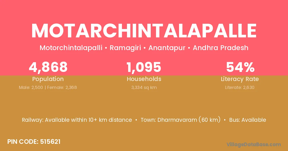 Dharmavaram (60 km) is the nearest town to Motarchintalapalle village for major economic activities and is located approximately 60 km away.