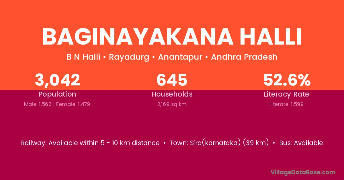 Sira(karnataka) (39 km) is the nearest town to Baginayakana Halli village for major economic activities and is located approximately 39 km away.