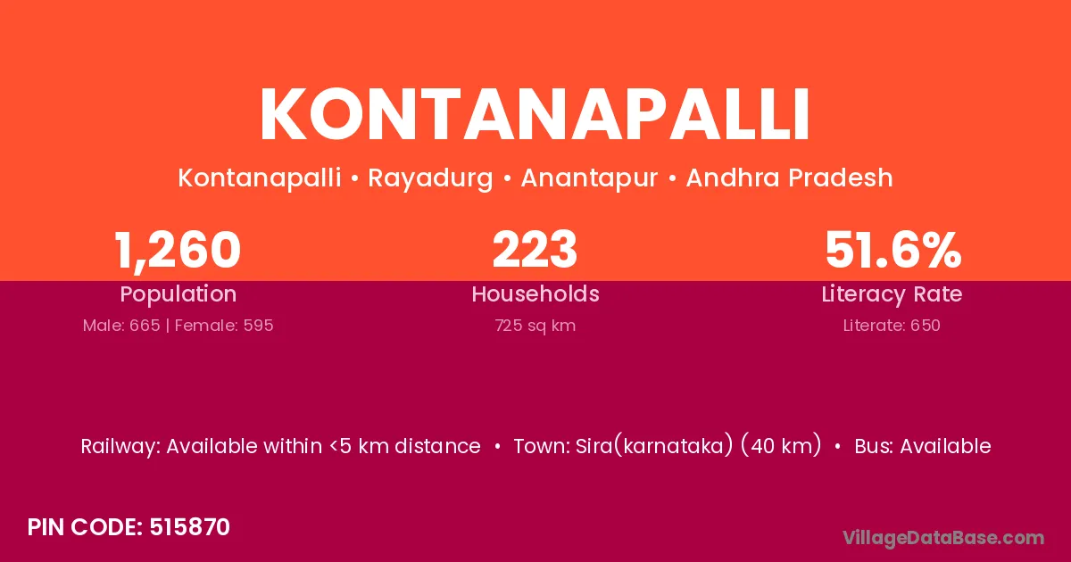 Sira(karnataka) (40 km) is the nearest town to Kontanapalli village for major economic activities and is located approximately 40 km away.