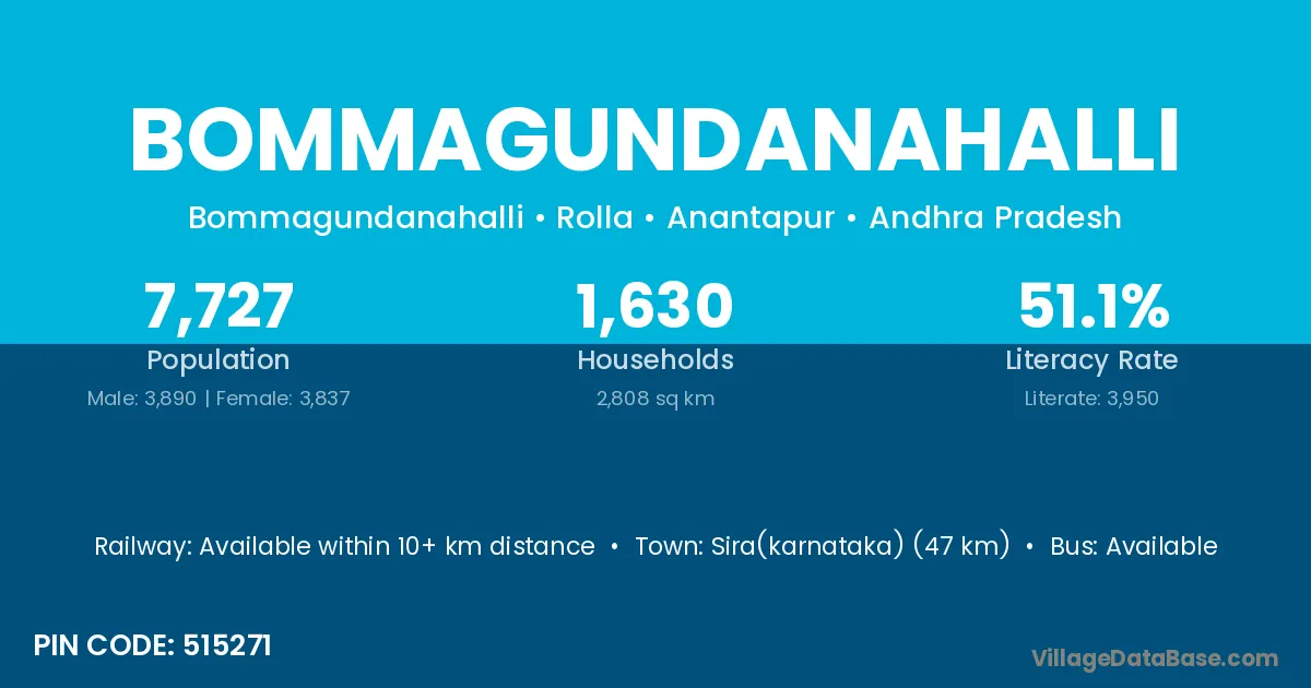 Bommagundanahalli village has a total population of 7,727 people, of which 3,890 are males and 3,837 are females.