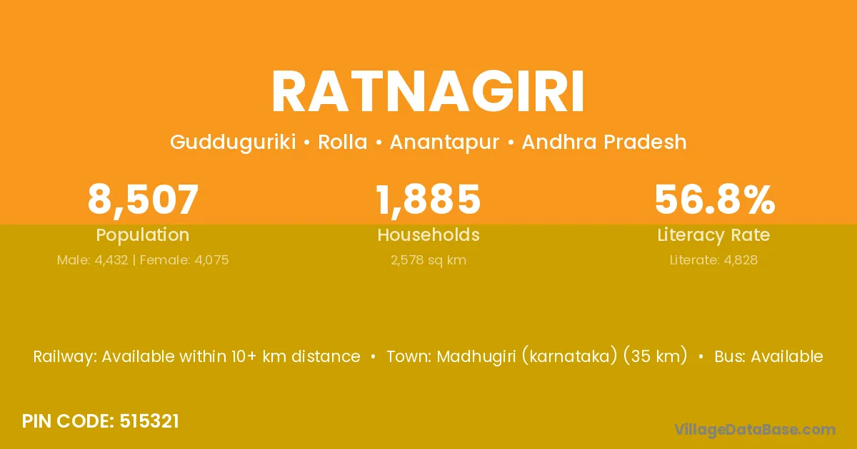 Madhugiri (karnataka) (35 km) is the nearest town to Ratnagiri village for major economic activities and is located approximately 35 km away.