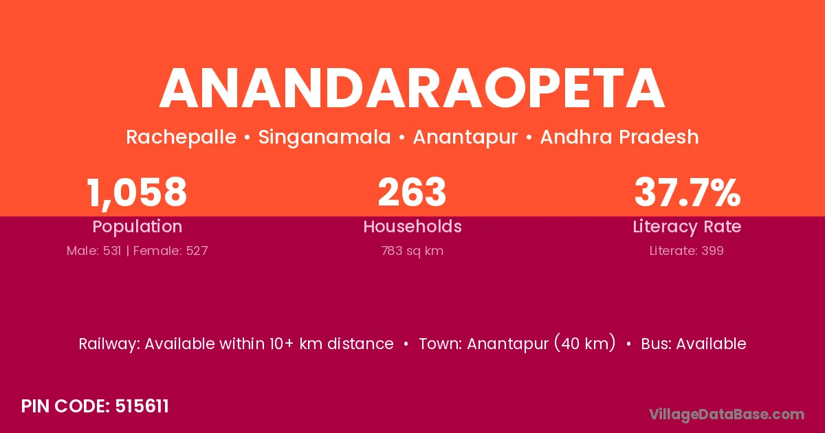 Anandaraopeta village has a total population of 1,058 people, of which 531 are males and 527 are females.