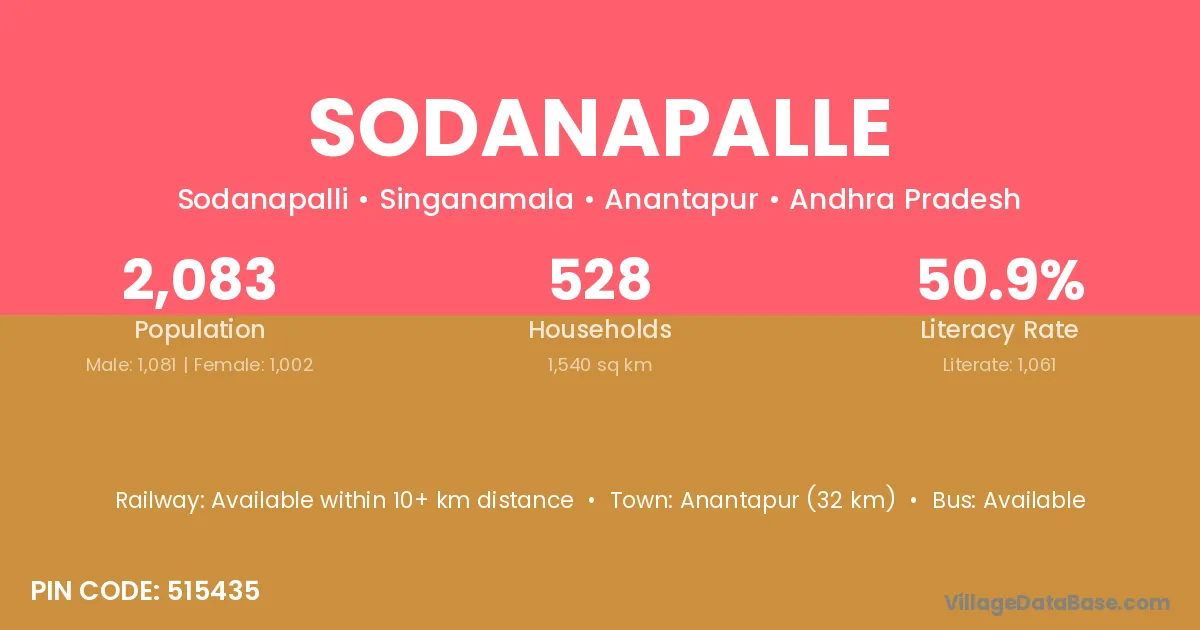 Sodanapalle village has a total population of 2,083 people, of which 1,081 are males and 1,002 are females.