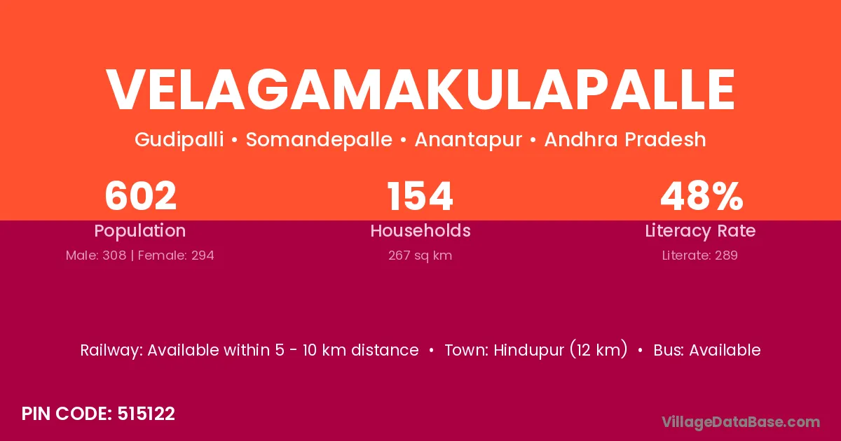 Velagamakulapalle village has a total population of 602 people, of which 308 are males and 294 are females.