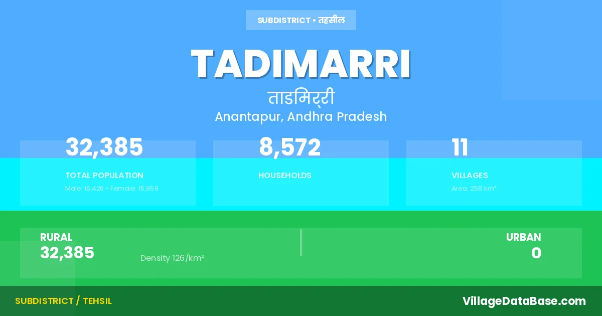 According to the 2011 census The total area of Tadimarri Mandal is 258 km², with a population of 32385 people. The population density is 126 inhabitants per square kilometre, and there are approximately 8572 houses in the sub district.