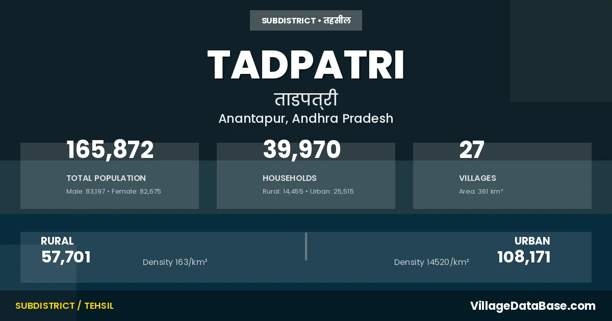 According to the 2011 census The total area of Tadpatri Mandal is 361 km², with a population of 165872 people. The population density is 459 inhabitants per square kilometre, and there are approximately 39970 houses in the sub district.