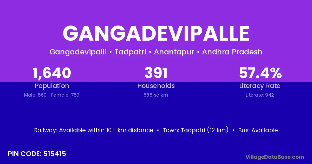 Tadpatri (12 km) is the nearest town to Gangadevipalle village for major economic activities and is located approximately 12 km away.