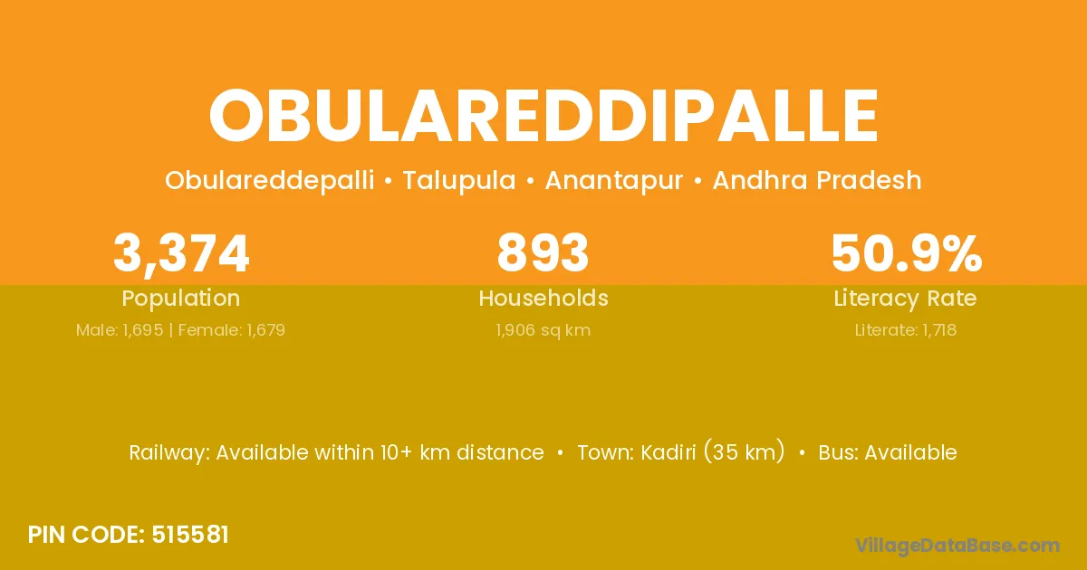 Kadiri (35 km) is the nearest town to Obulareddipalle village for major economic activities and is located approximately 35 km away.