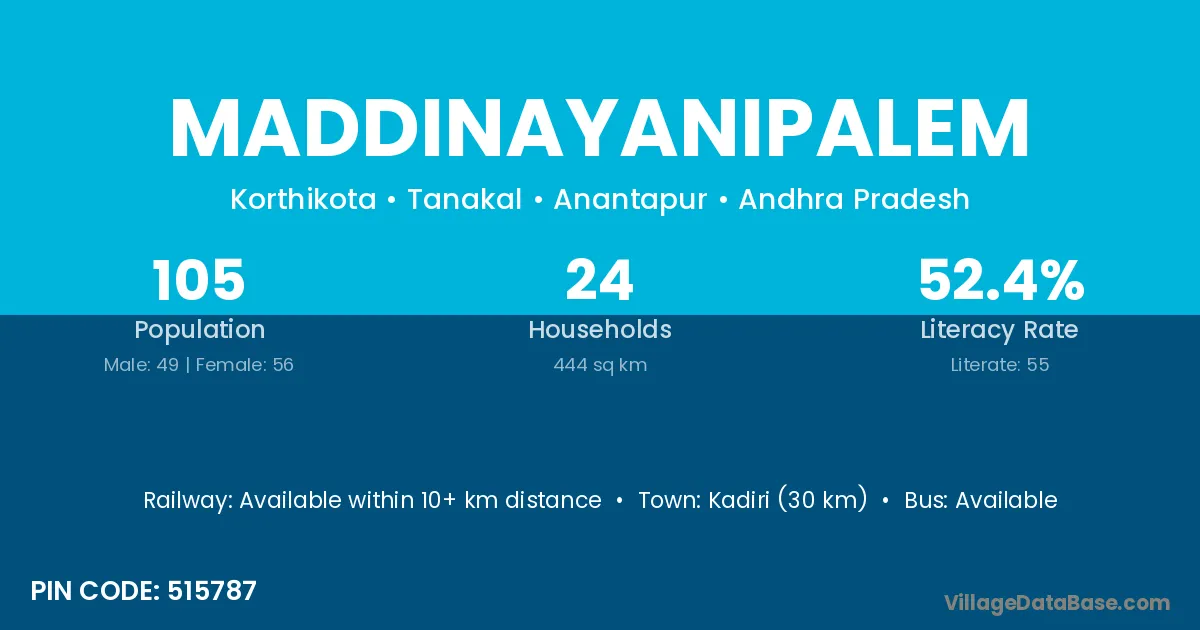 Kadiri (30 km) is the nearest town to Maddinayanipalem village for major economic activities and is located approximately 30 km away.