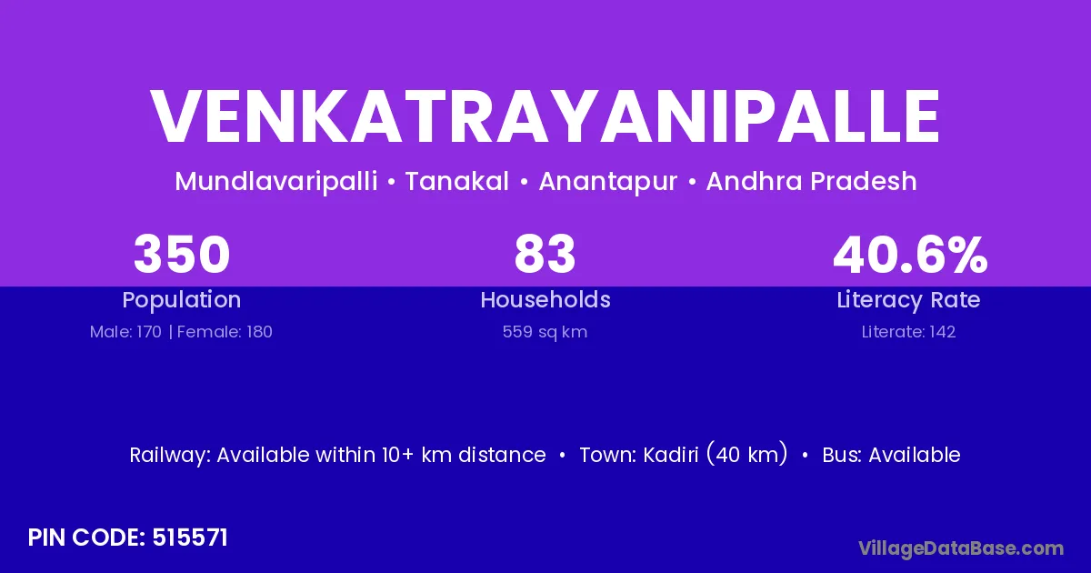 Kadiri (40 km) is the nearest town to Venkatrayanipalle village for major economic activities and is located approximately 40 km away.