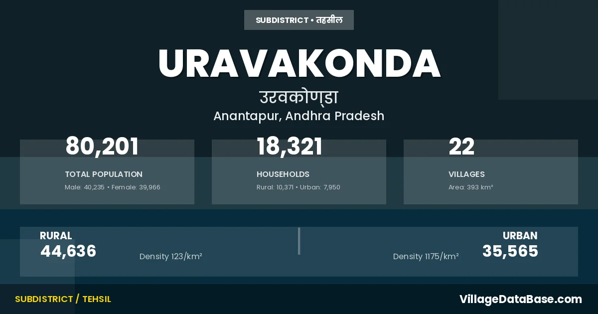 According to the 2011 census The total area of Uravakonda Mandal is 393 km², with a population of 80201 people. The population density is 204 inhabitants per square kilometre, and there are approximately 18321 houses in the sub district.