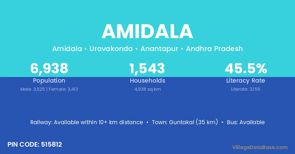 Guntakal (35 km) is the nearest town to Amidala village for major economic activities and is located approximately 35 km away.