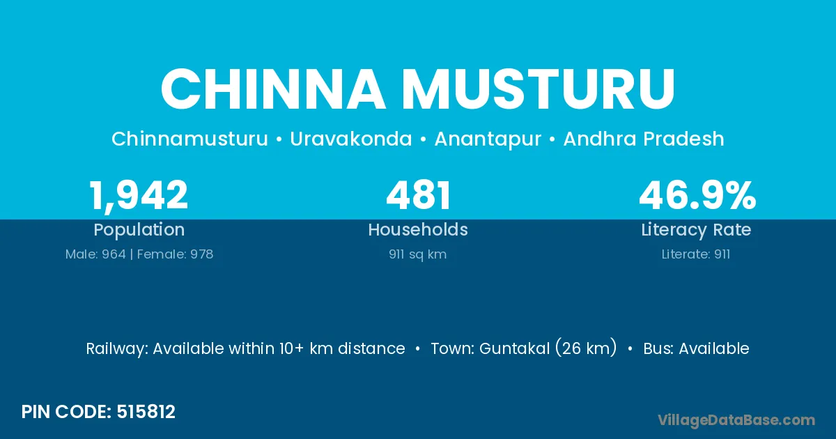 Guntakal (26 km) is the nearest town to Chinna Musturu village for major economic activities and is located approximately 26 km away.