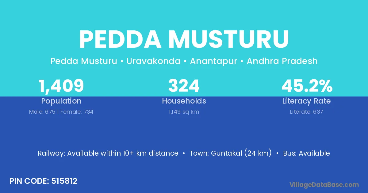Guntakal (24 km) is the nearest town to Pedda Musturu village for major economic activities and is located approximately 24 km away.