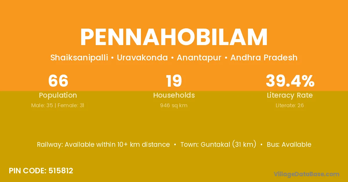 Guntakal (31 km) is the nearest town to Pennahobilam village for major economic activities and is located approximately 31 km away.
