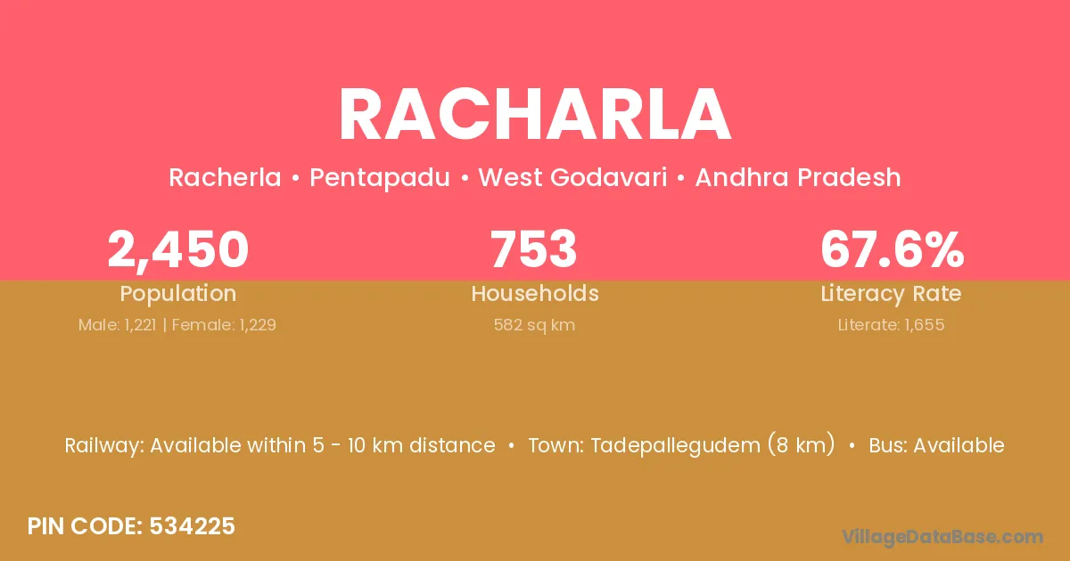The literacy rate of Racharla village is 58.09%. Male literacy stands at 69.03% and female literacy at 46.62%.
