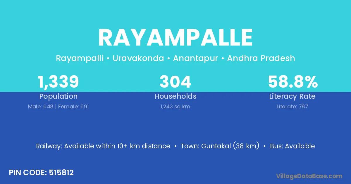 Guntakal (38 km) is the nearest town to Rayampalle village for major economic activities and is located approximately 38 km away.