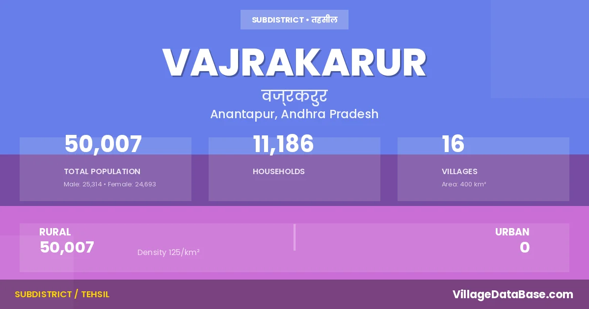 According to the 2011 census The total area of Vajrakarur Mandal is 400 km², with a population of 50007 people. The population density is 125 inhabitants per square kilometre, and there are approximately 11186 houses in the sub district.