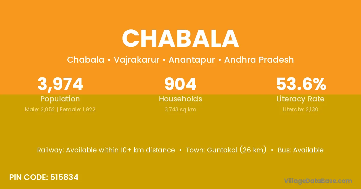 Guntakal (26 km) is the nearest town to Chabala village for major economic activities and is located approximately 26 km away.