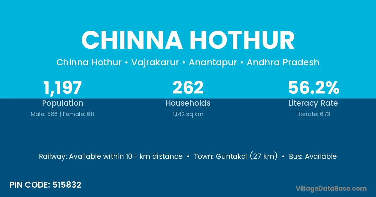 Guntakal (27 km) is the nearest town to Chinna Hothur village for major economic activities and is located approximately 27 km away.