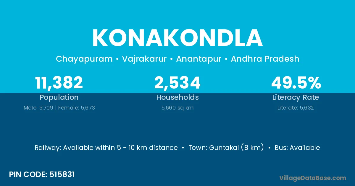 Guntakal (8 km) is the nearest town to Konakondla village for major economic activities and is located approximately 8 km away.
