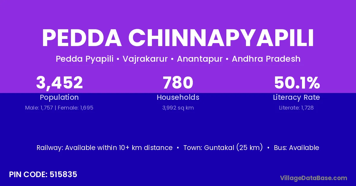 Guntakal (25 km) is the nearest town to Pedda Chinnapyapili village for major economic activities and is located approximately 25 km away.