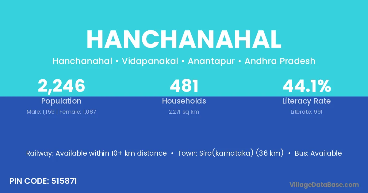Sira(karnataka) (36 km) is the nearest town to Hanchanahal village for major economic activities and is located approximately 36 km away.